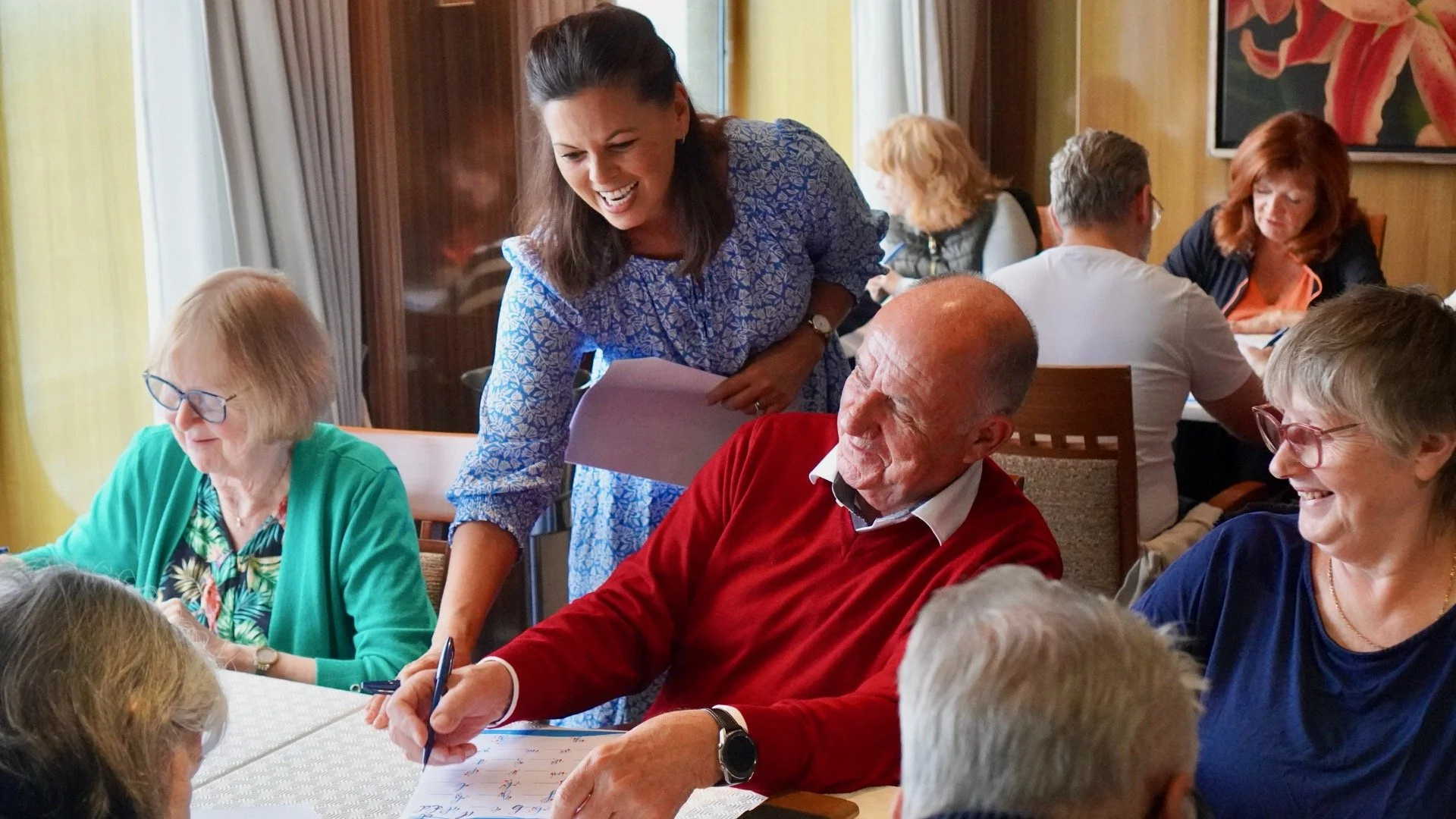 Claire Delfont teaching Cunard guests brush pen calligraphy on the high seas