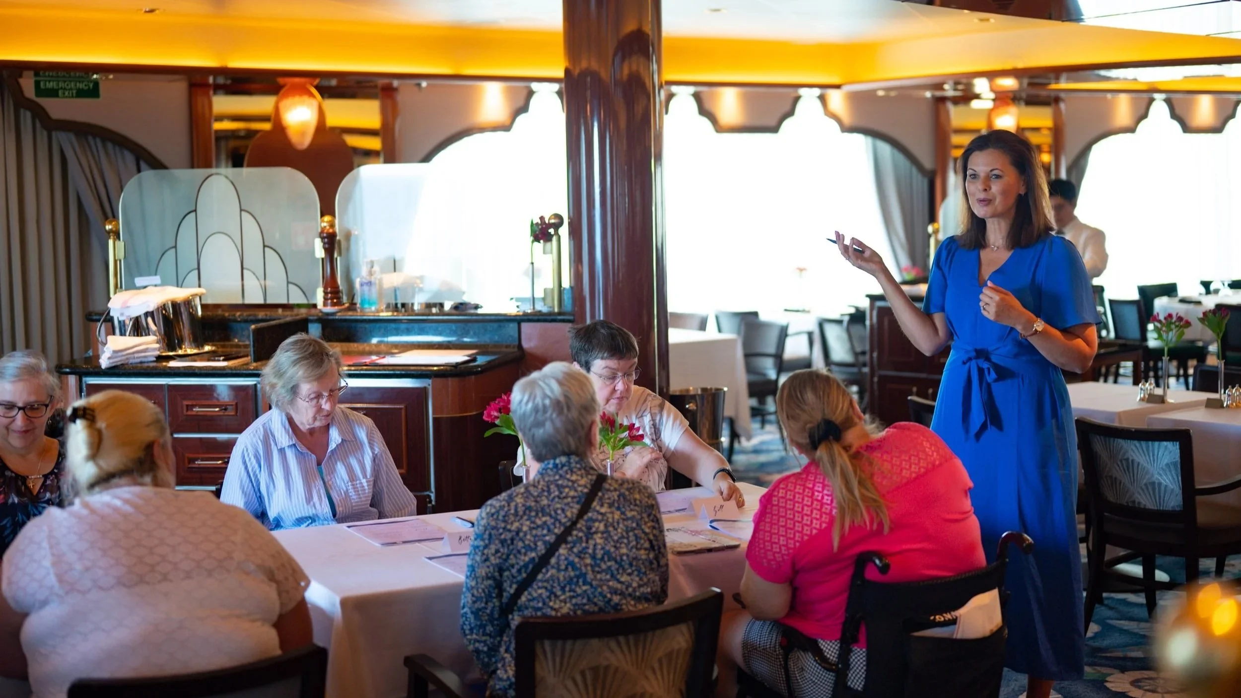 Claire Delfont teaching a brush pen calligraphy workshop onboard Cunard’s Queen Mary 2